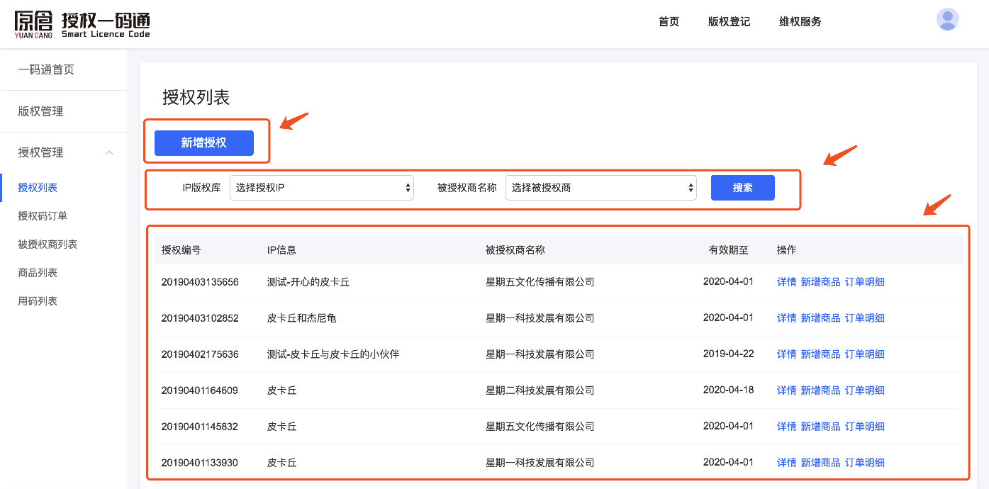 如果需要进行信息筛选,可以通过「IP版权库」(即授权IP主形象的名称)和「被授权商名称」进行搜索。