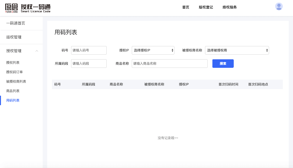 如果需要进行信息筛选,可以通过「码号」,「授权IP」,「被授权商名称」,「所属码段」和「商品名称」进行搜索。 您可以点击码号查看该授权码的「扫码历史」。
